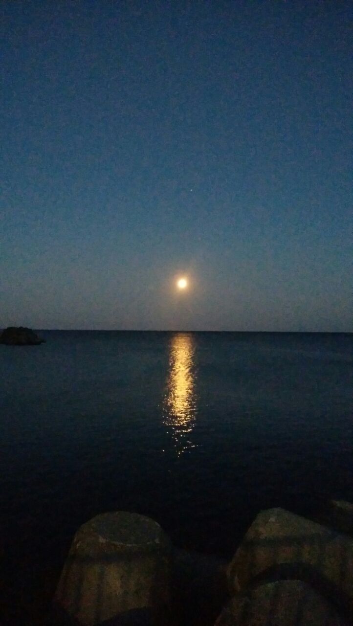 雲もなく、それはきれいなまん丸お月様が水平線から上ってきました。