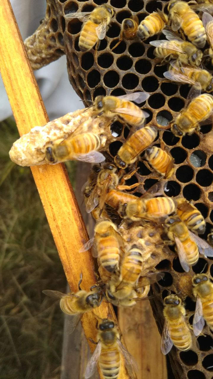2018年04月24日 はちのハッチ 鳥の雛がかえる事をハッチって言うけれど、王台から女王蜂が出てくることは何て言うのかな?今日は女王様が王台から出てくる所を見る事が出来ました!今日は自分の内検ではなかったので、写真を撮ることが出来ましたが、女王様が王台を齧ってる→シャッターチャンス!→スマホを取りに行く→出てしまっていた。。。って感じの写真になりました。この写真の中に女王様がいますから探して見てくださいね。